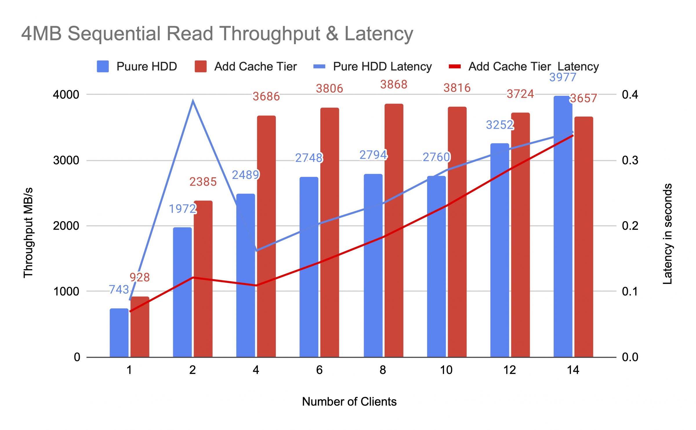 แผนภูมิแสดงให้เห็นว่าประสิทธิภาพของพูล HDD สะอาดได้รับการเพิ่มขึ้นอย่างมีนัยสำคัญหลังจากเพิ่มพูลแคช NVMe