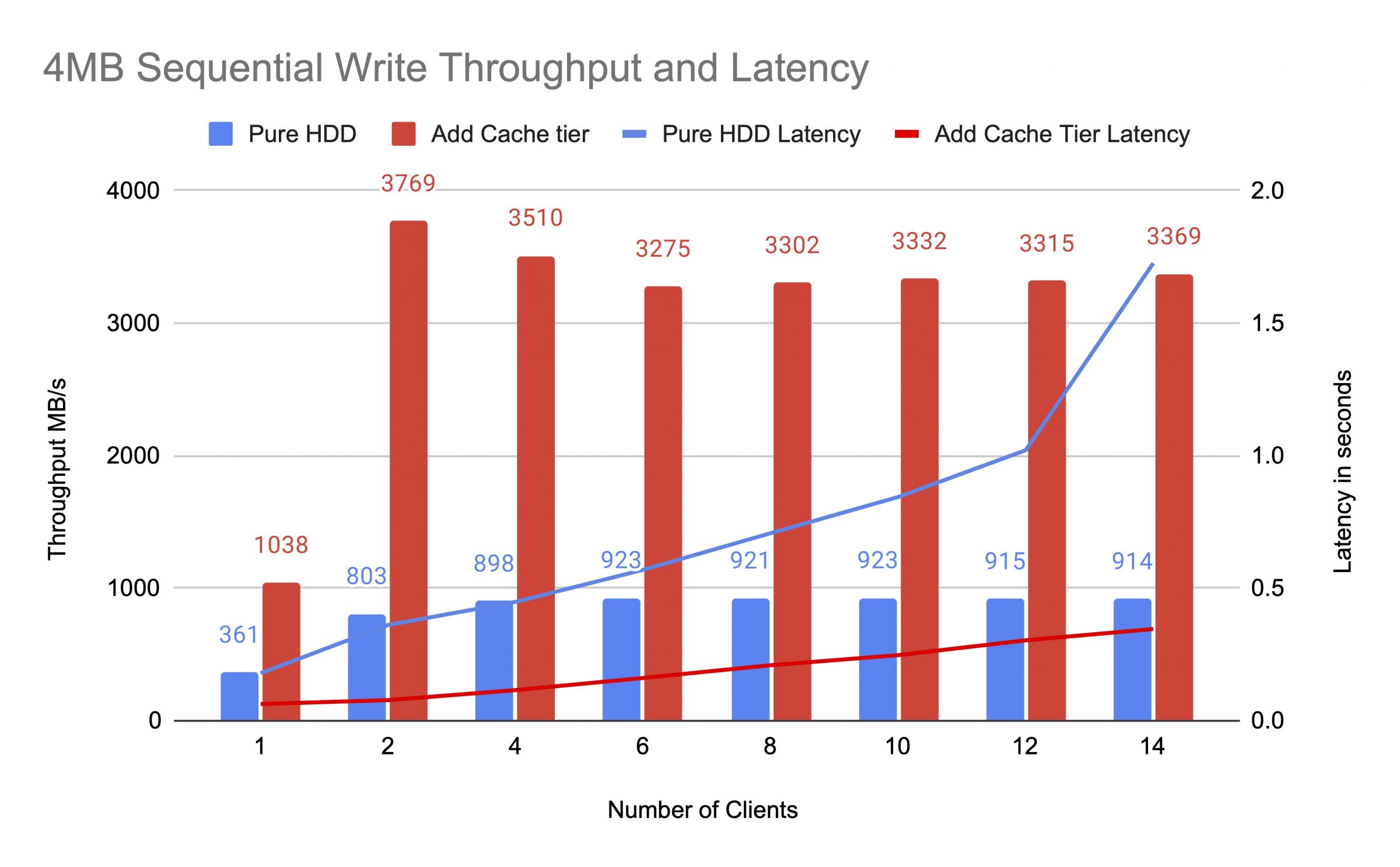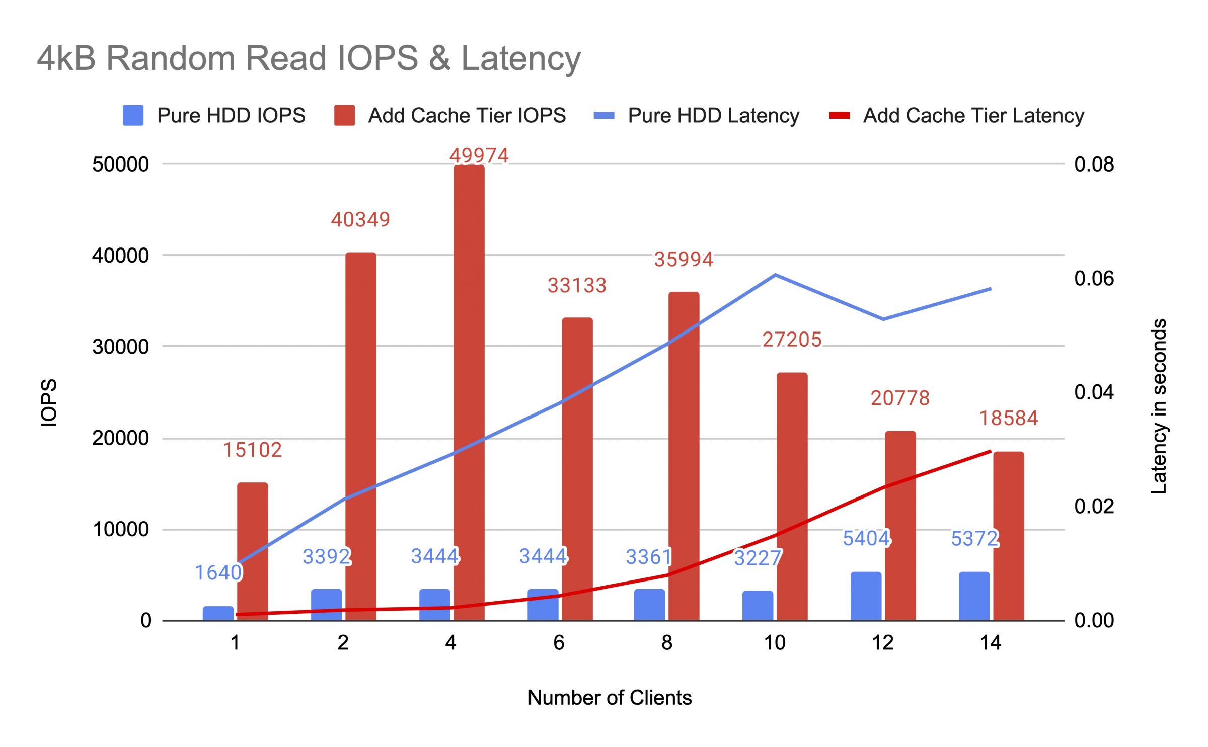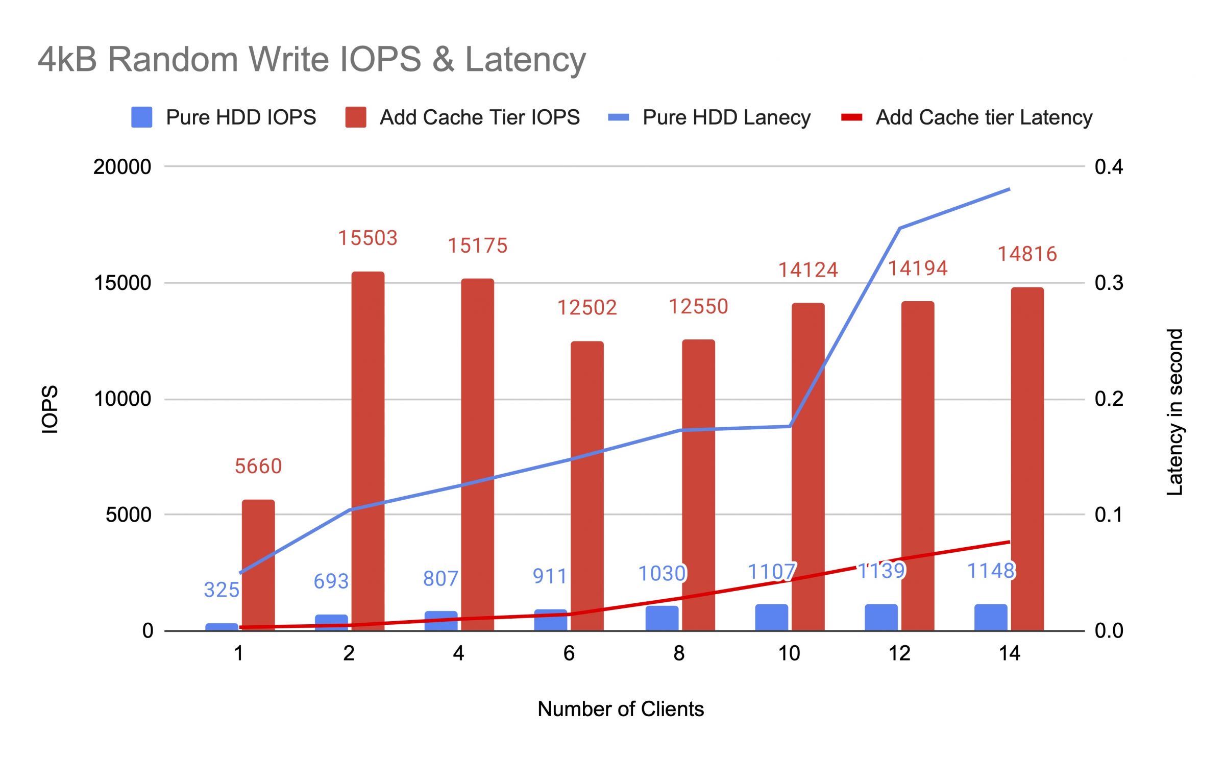 เราทดสอบ HDD pool ก่อนและหลังจากเพิ่ม cache tier โดยใช้ไคลเอ็นต์สูงสุด 14 คนเพื่อสร้างภาระการทดสอบ แต่ละลูกค้าติดตั้ง RBD สำหรับการทดสอบ fio การทดสอบเริ่มต้นด้วยลูกค้าหนึ่งและเพิ่มจำนวนลูกค้าเมื่องานทดสอบแต่ละงานเสร็จสิ้น รอบทดสอบแต่ละรอบใช้เวลาห้านาทีและถูกควบคุมโดยอัตโนมัติโดย Jenkins ประสิทธิภาพของงานทดสอบคือผลรวมของผลลัพธ์ของลูกค้าทั้งหมด ก่อนที่จะทดสอบการจัดชั้นแคช เราเขียนข้อมูลลงใน RBDs จนกระทั่งพูลแคชชั้นถูกเต็มตามอัตราส่วนเป้าหมายของแคชเซฟ (0.8)